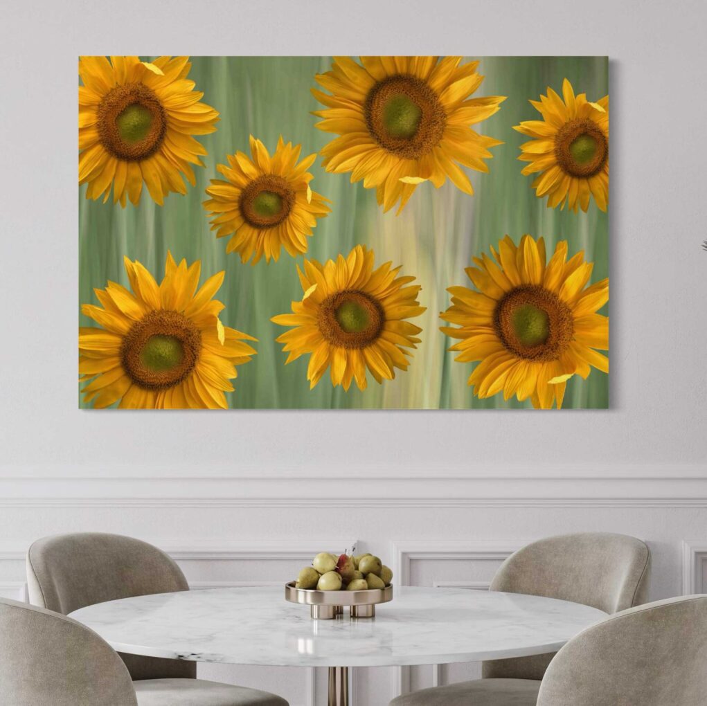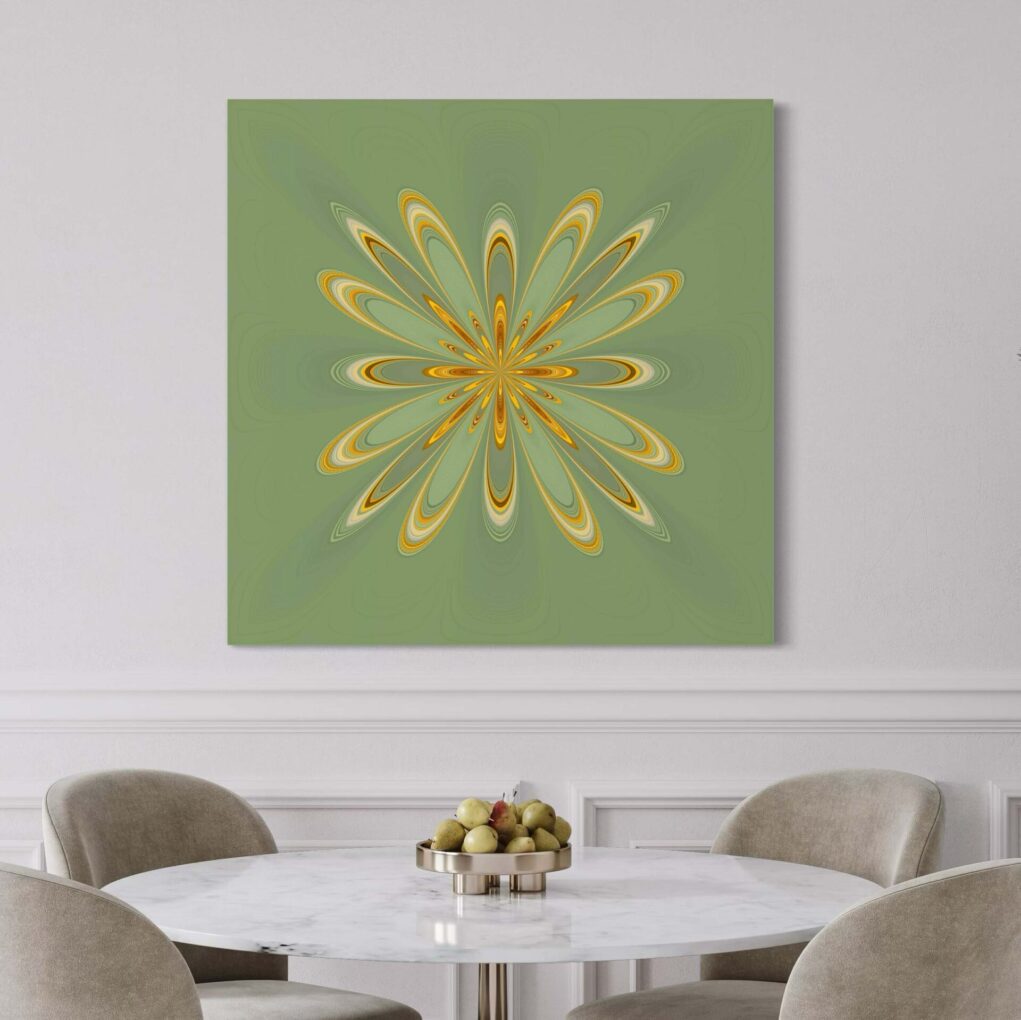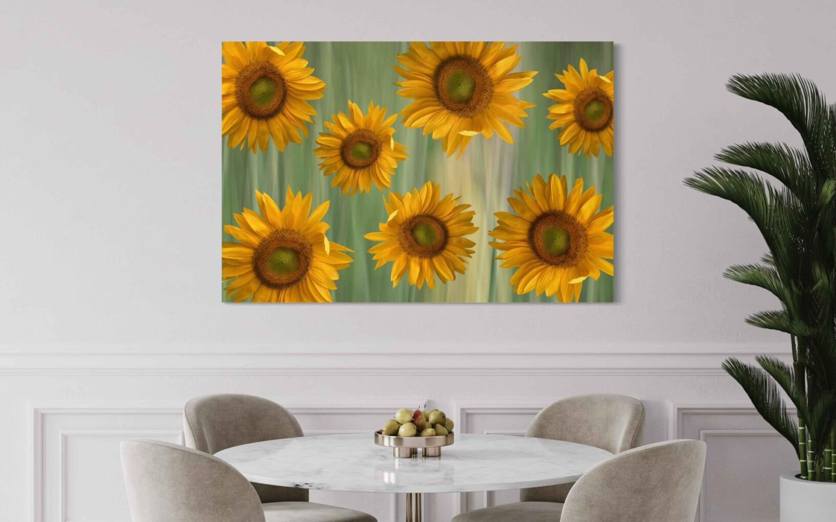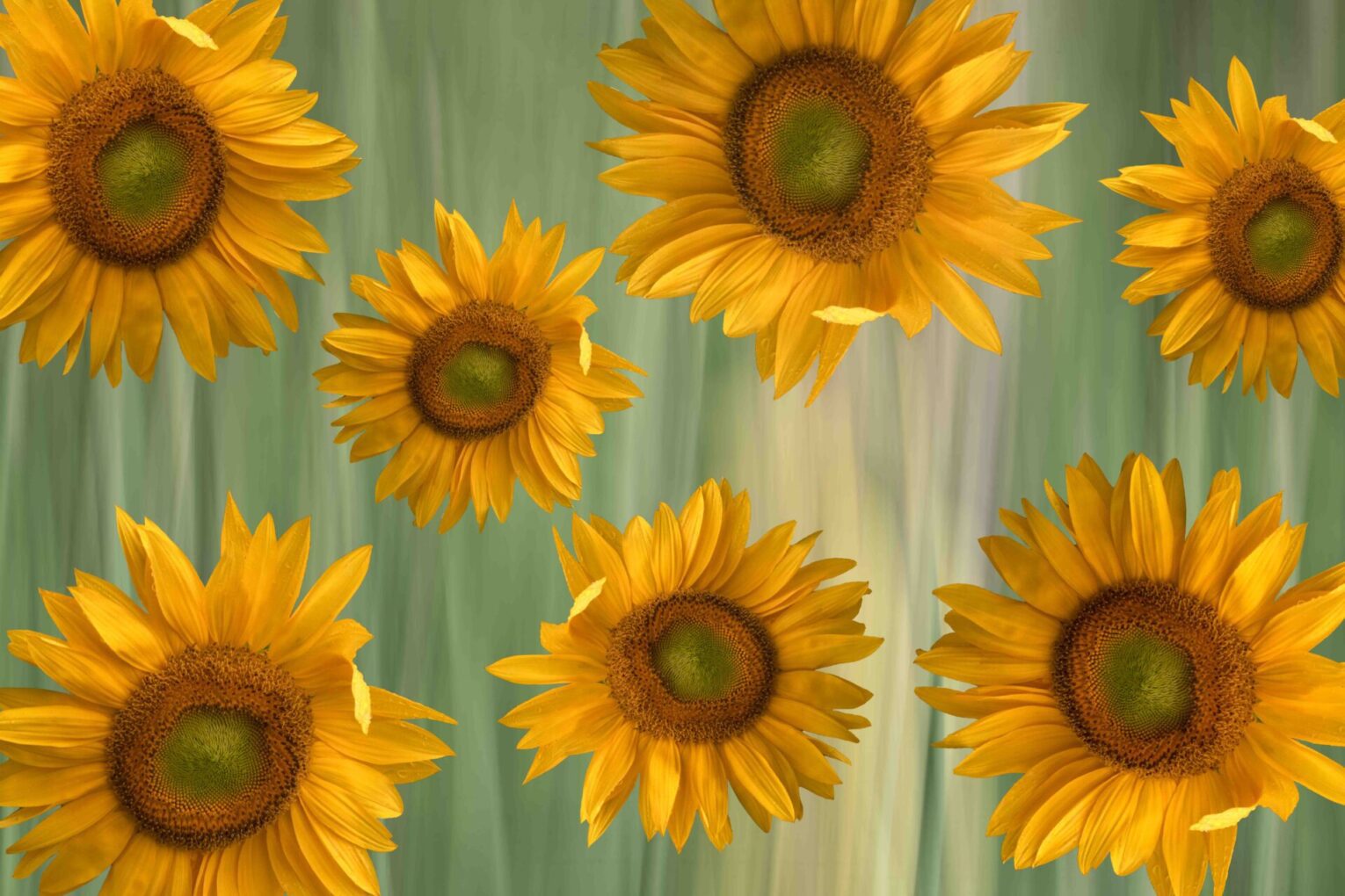 This collection is based on the charming form of an expressive sunflower with one bent petal against an abstract background created from the soft greens and golds of the garden setting. These rhythmic, layered compositions celebrate the warmth, texture, and joyful character of summer sunflowers. —Lauren Karp