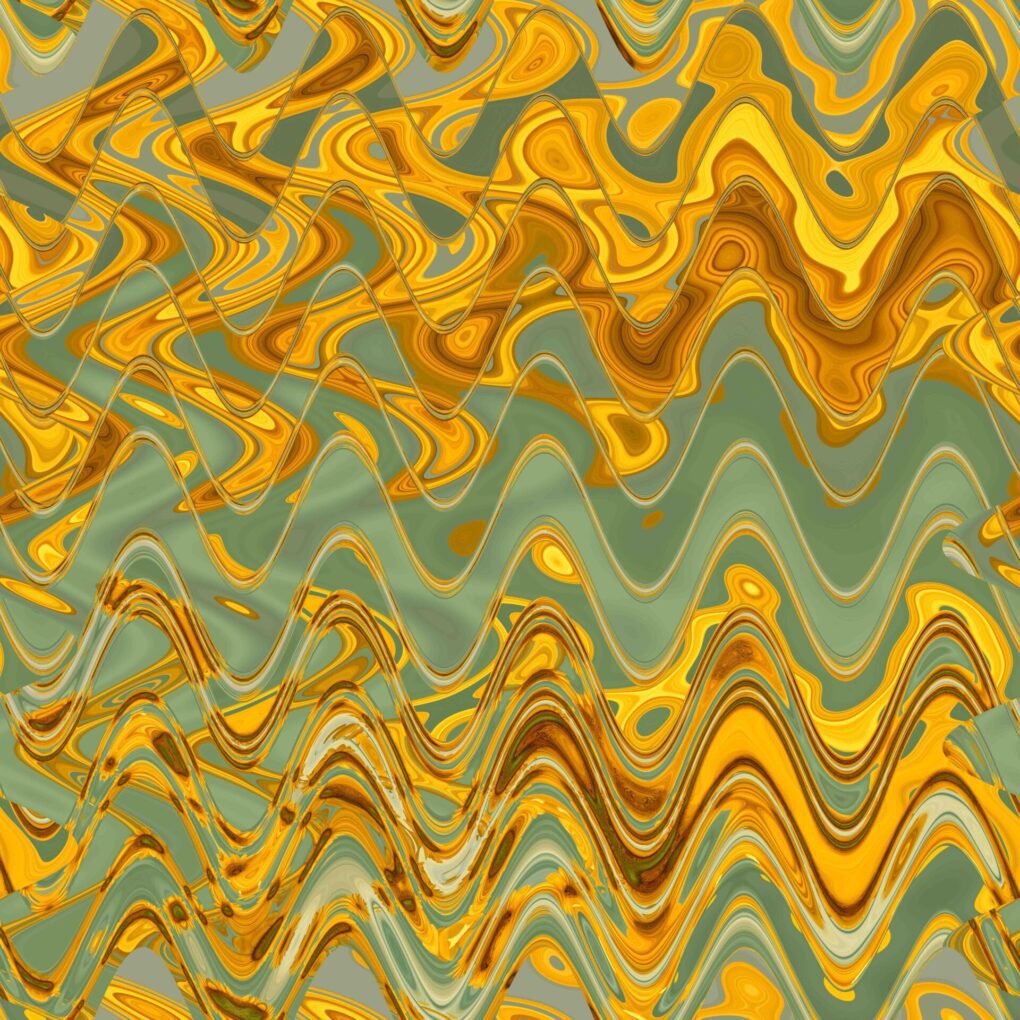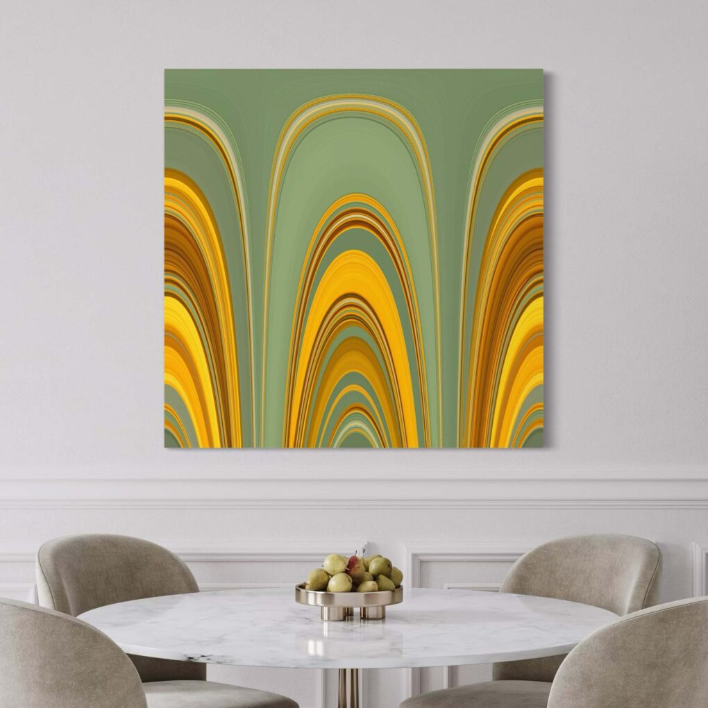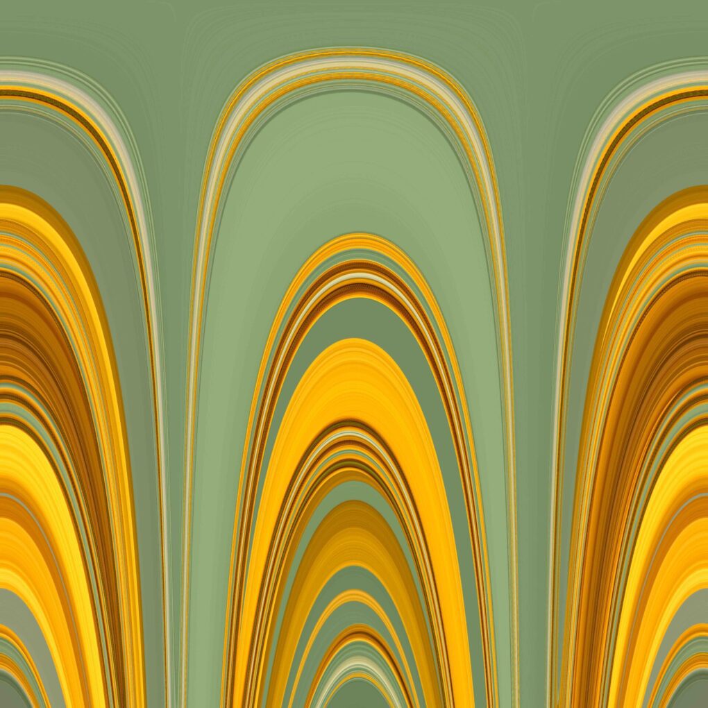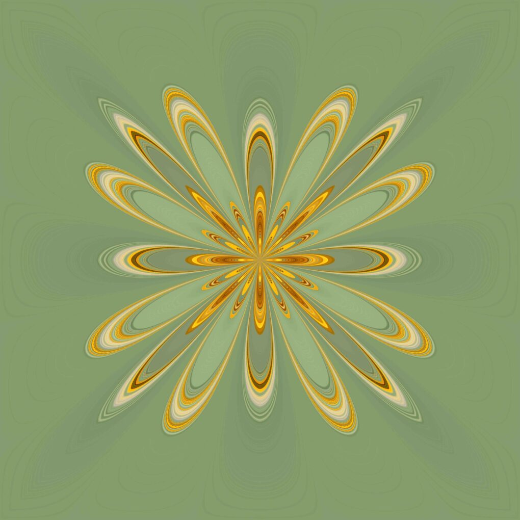 This collection is based on the charming form of an expressive sunflower with one bent petal against an abstract background created from the soft greens and golds of the garden setting. These rhythmic, layered compositions celebrate the warmth, texture, and joyful character of summer sunflowers. —Lauren Karp