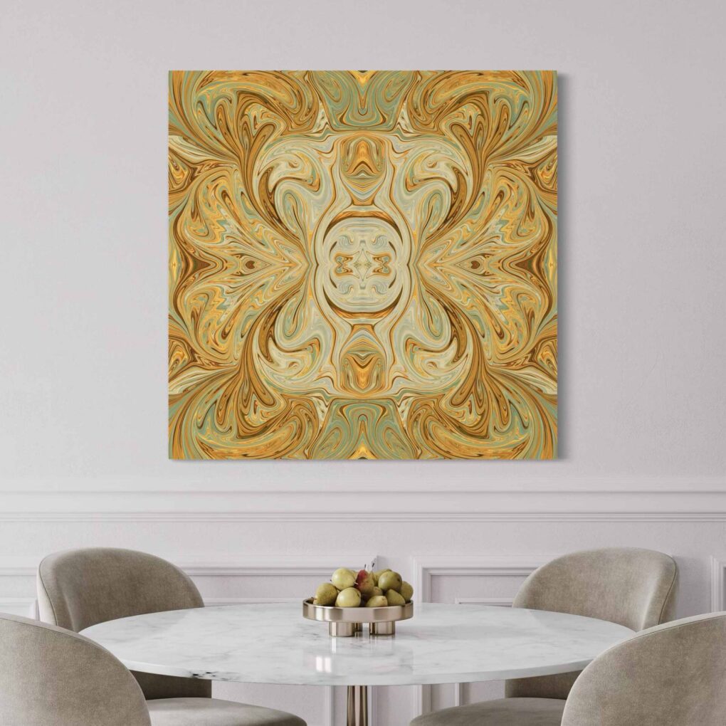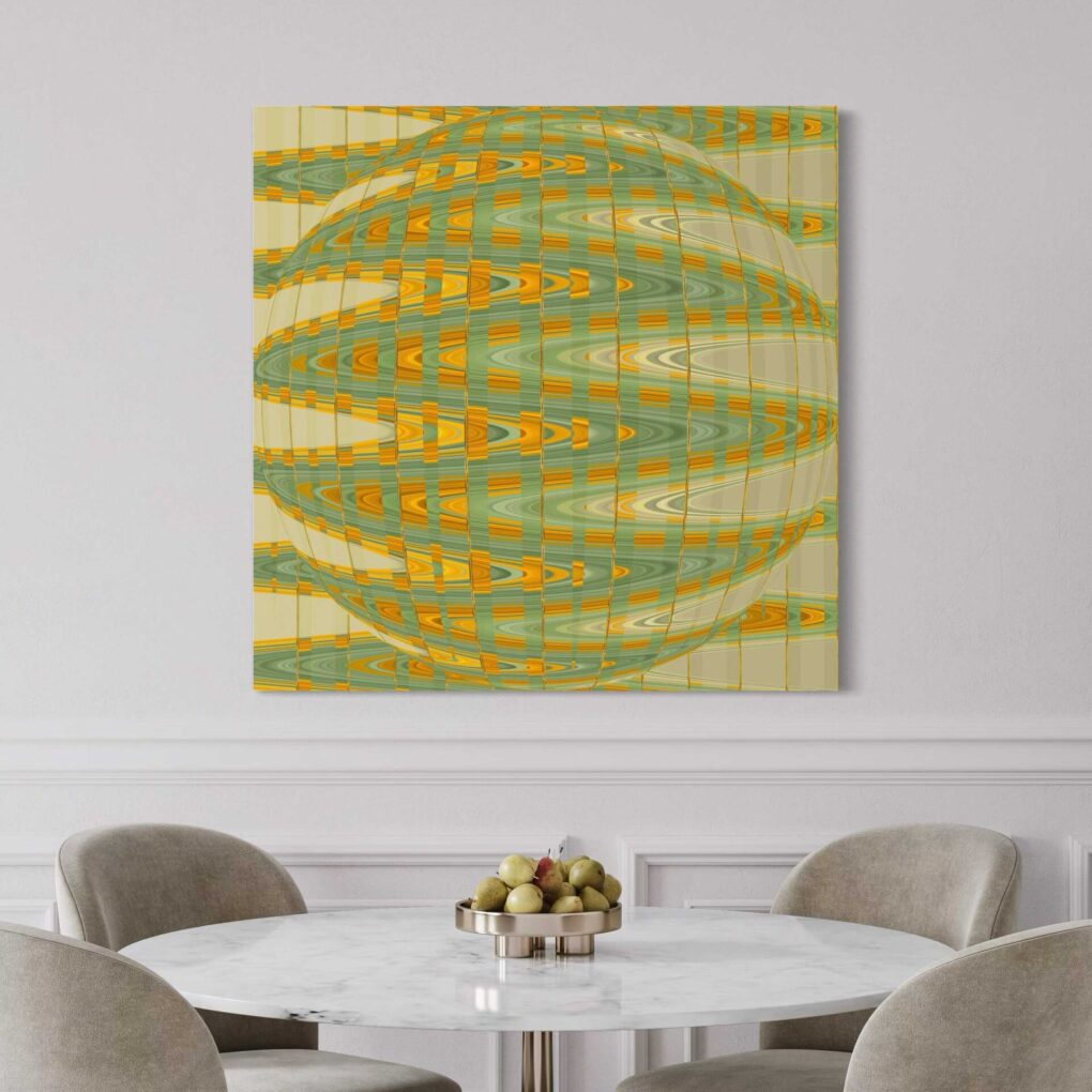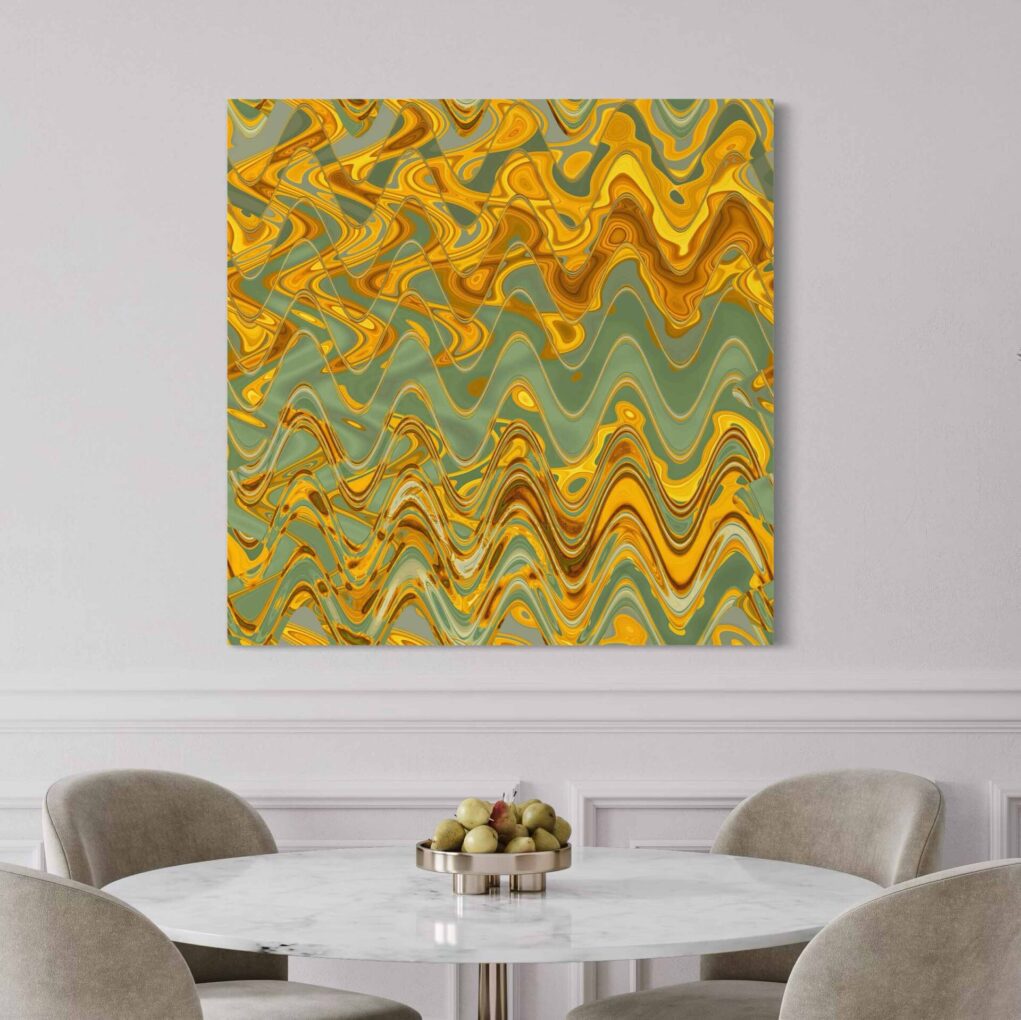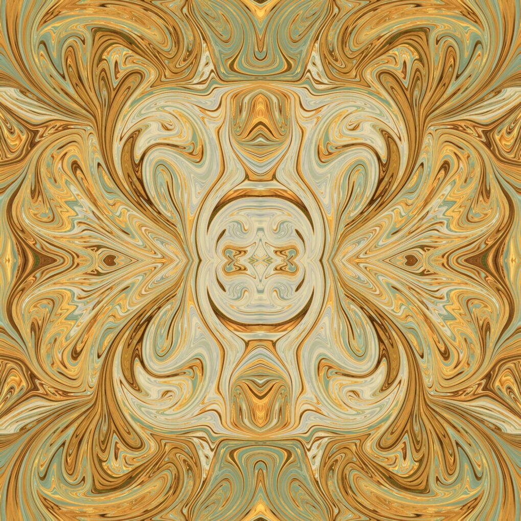 This collection is based on the charming form of an expressive sunflower with one bent petal against an abstract background created from the soft greens and golds of the garden setting. These rhythmic, layered compositions celebrate the warmth, texture, and joyful character of summer sunflowers. —Lauren Karp