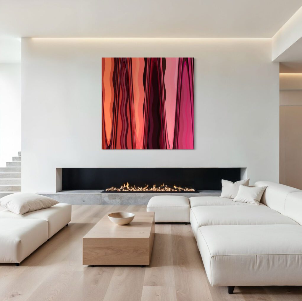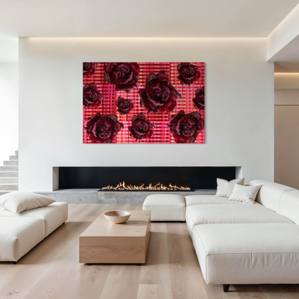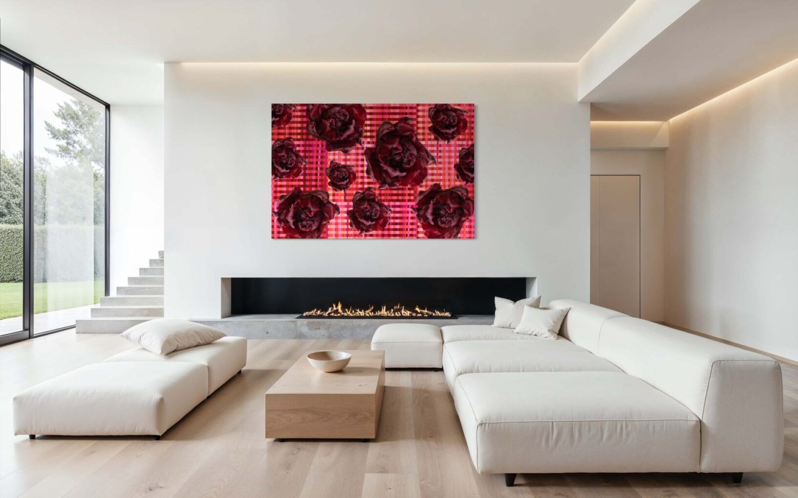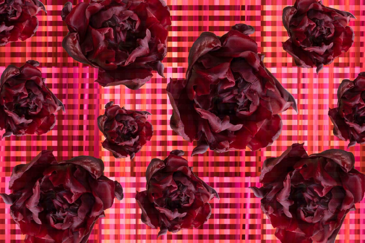 For this collection, I photographed a velvety crimson tulip and merged the flower with an abstract background derived from vivid colors of the surrounding spring garden. Bold reds, pinks, and flowing forms interplay to create contemporary compositions filled with energy and modern elegance. —Lauren Karp